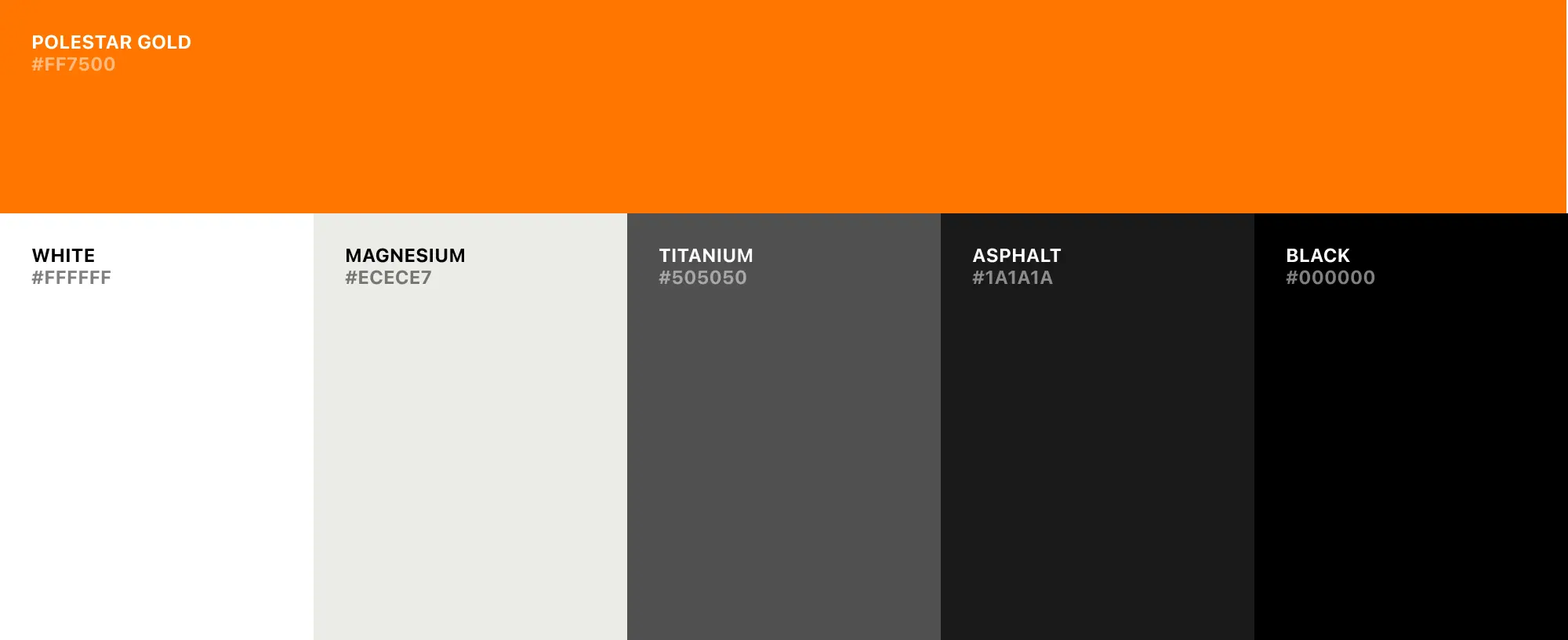 Anchored by Polestar’s signature gold, this palette utilizes a monochromatic scale inspired by the vehicle’s physical materials. By referencing textures like Magnesium and Asphalt, the system creates a seamless visual continuity between the cockpit hardware and the digital interface.